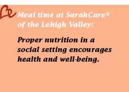 Served in our cheerful dining area, our nutrition plan includes a light breakfast, a full hot meal at noontime,